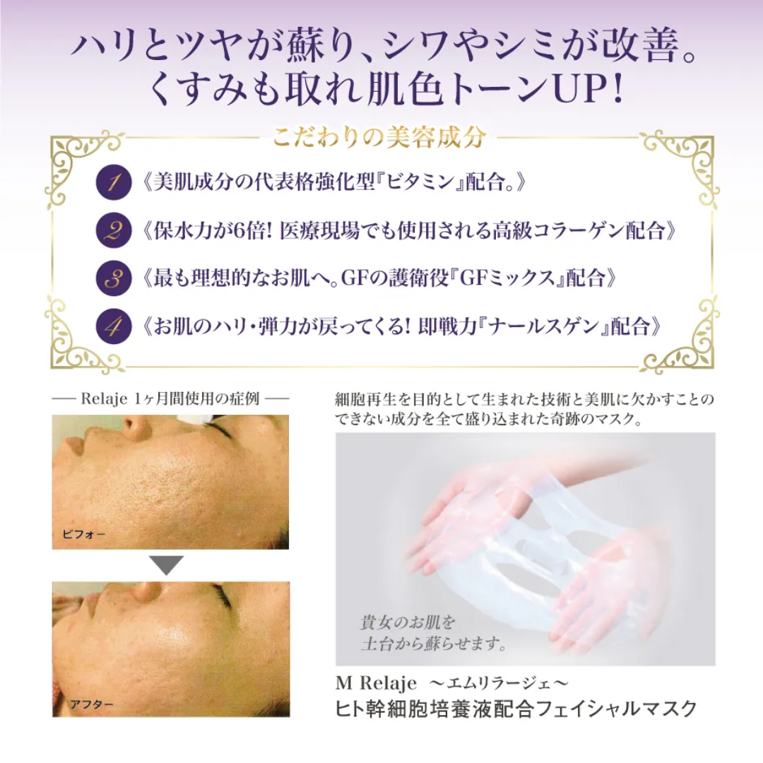 医療現場でも使用されている導入技術を用いたヒト幹細胞培養液のフェイスマスクです。こだわりの美容成分(保湿・美白効果に優れた特殊ビタミンであるHITA-HA、保水力が6倍の高級コラーゲン、GFの護衛役のGFミックス、お肌のハリ・弾力が戻ってくるナールスゲン※特許成分)配合。マスクの素材にはバイオセルロースという特殊な素材を採用。髪の毛の約1,000分の1ほどの細かい繊維で高密着・高保湿を実現。水分が蒸発し、かえって乾燥してしまうことがありません。ナタデココのようなプルプル素材で、15~20分美容成分がじっくりお肌に働きかけます。2~100ナノレベルのキメ細かい繊維から構成されているため、美容液の携帯性、水分保持性、使用時の密着性、肌への浸透に優れた素材です。密着性が高く、目尻・鼻・顎等の凸凹部分にもしっかり密着します。掃除・洗濯など動いている時にも剥がれてこないため、ながら美容も可能。